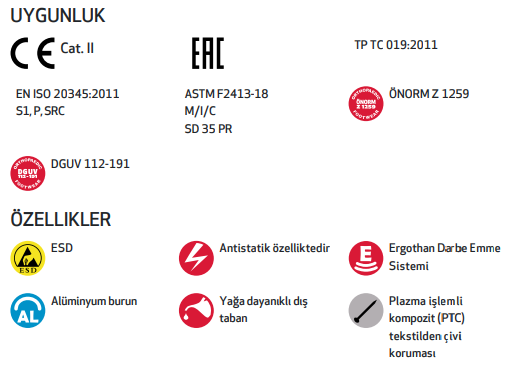 İÇ TABAN MALZEMESİ: Kumaş, Yumuşak EVA, Sert EVA, Poliester bazlı iletken iplik, Neo köpük, PORON XRD ‘den çift darbe emici bölge